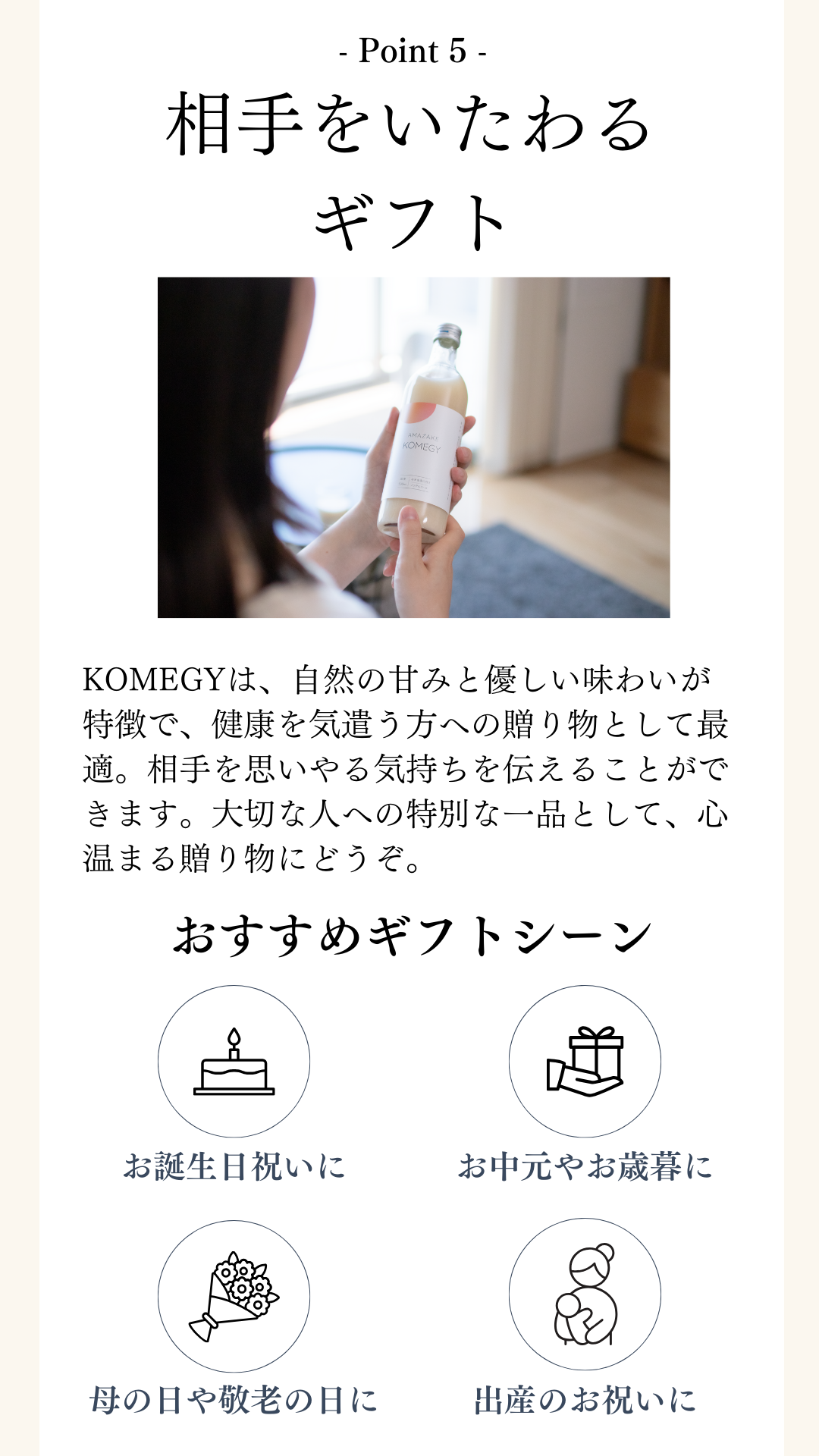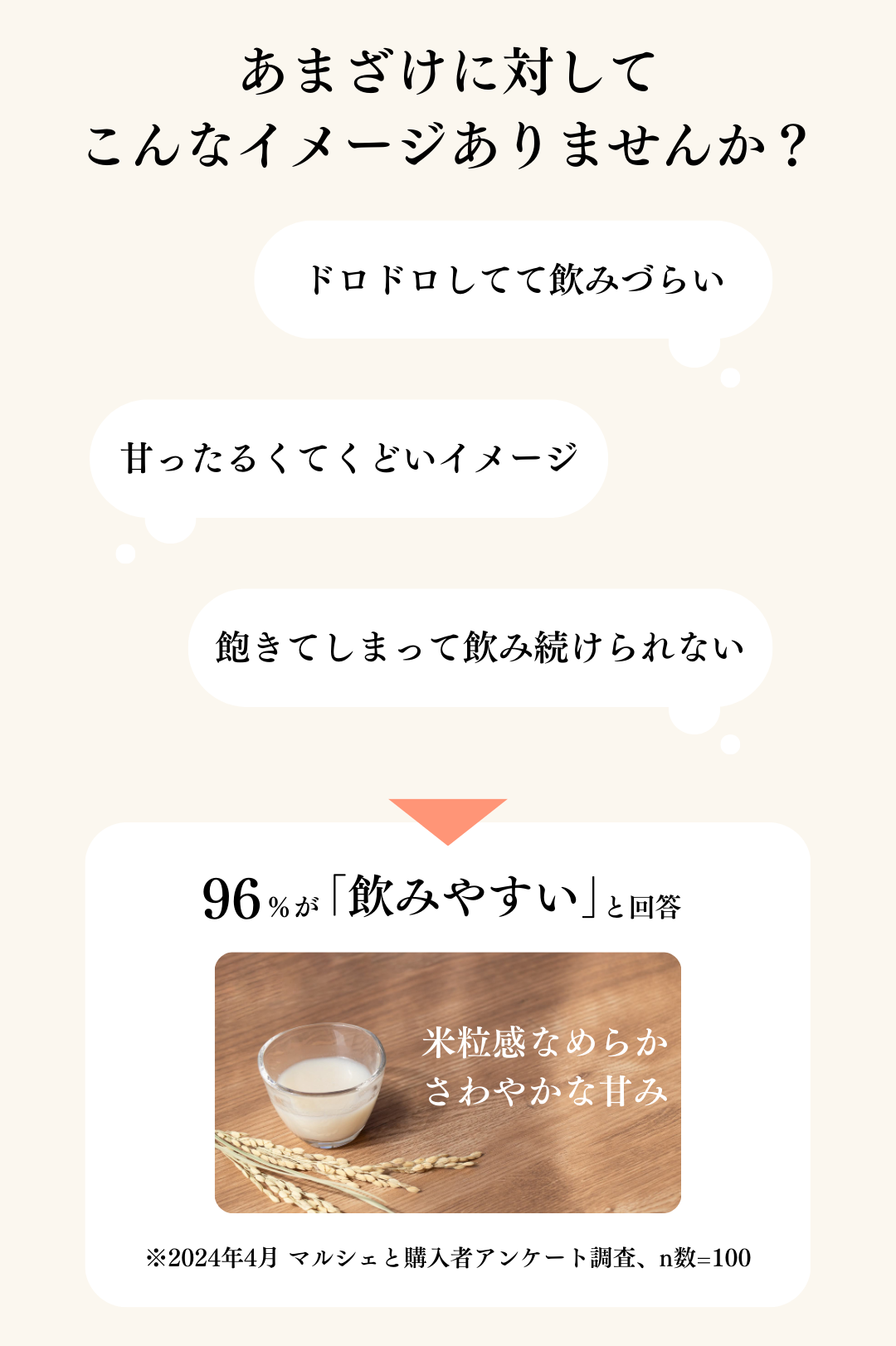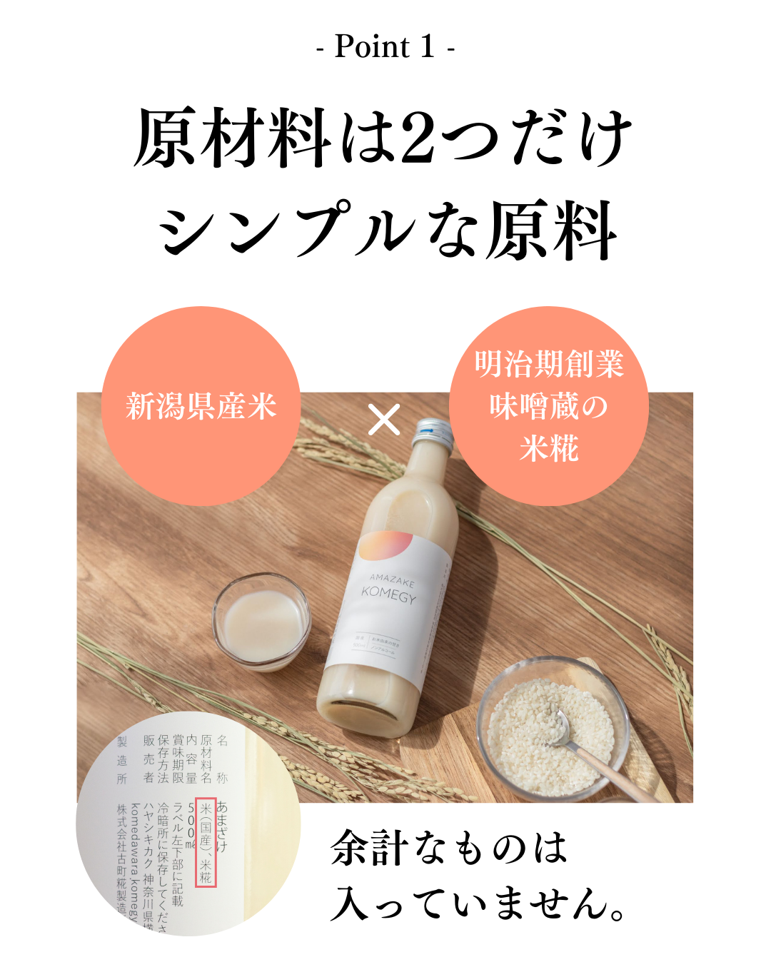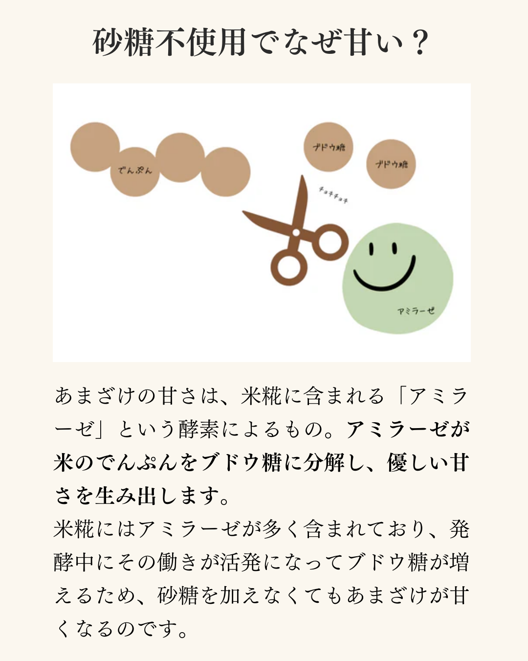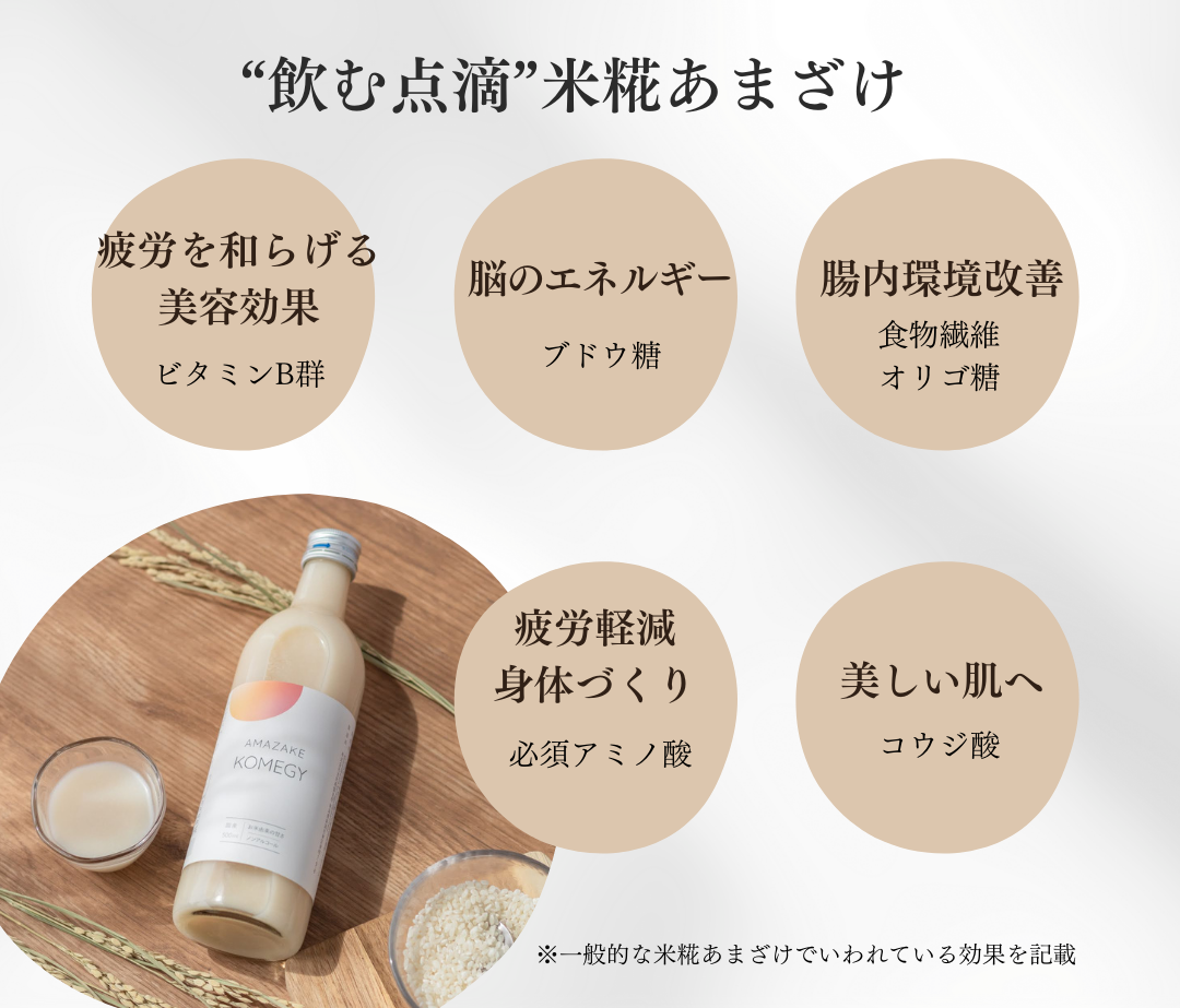 KOMEGYのあまざけは、砂糖不使用でありながら、米糀の自然な甘みがしっかりと感じられるため、ヘルシーでありながら美味しく飲むことができます。日常の忙しい生活の中で手軽に栄養補給をしたい方や、美容と健康を意識する方におすすめです。