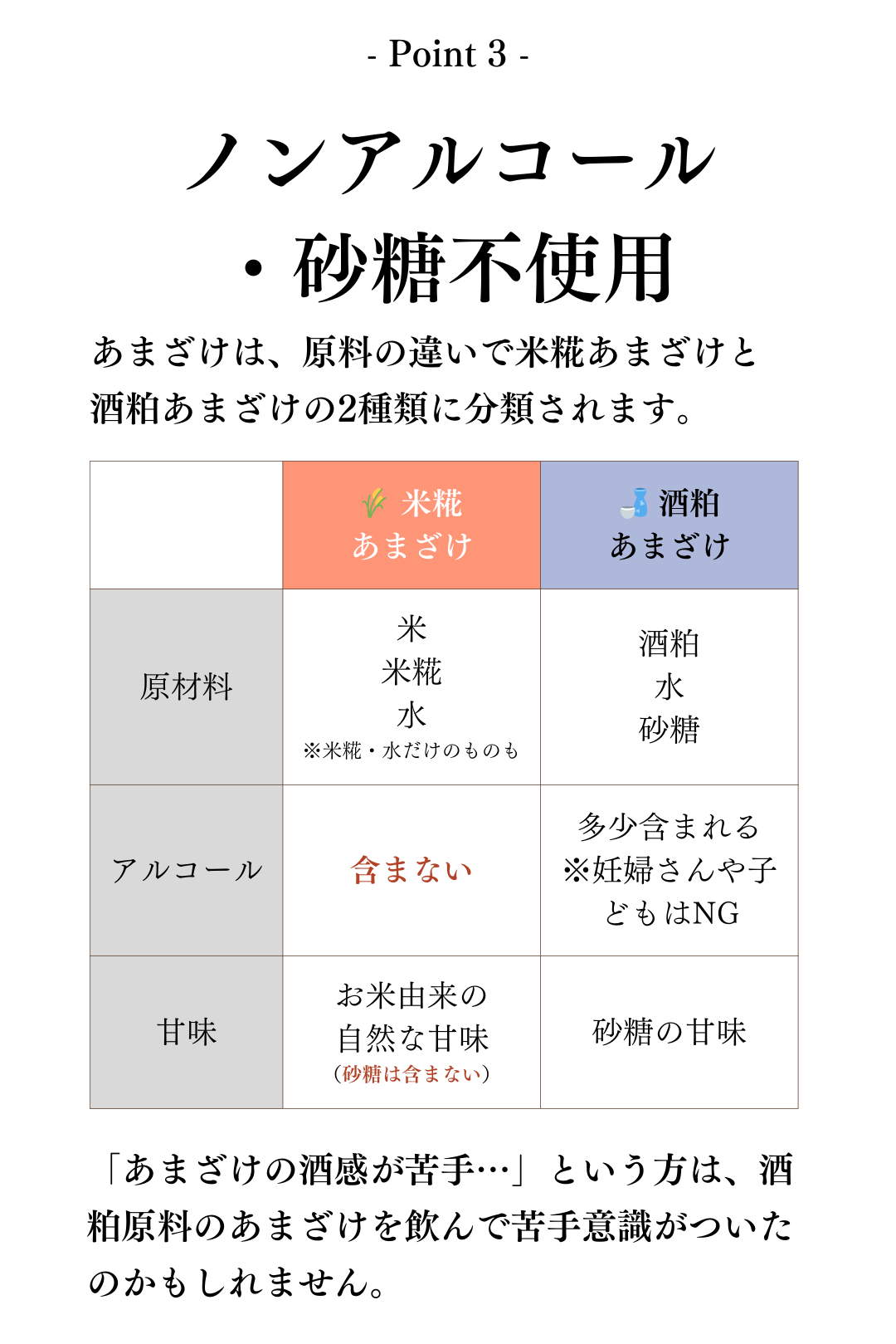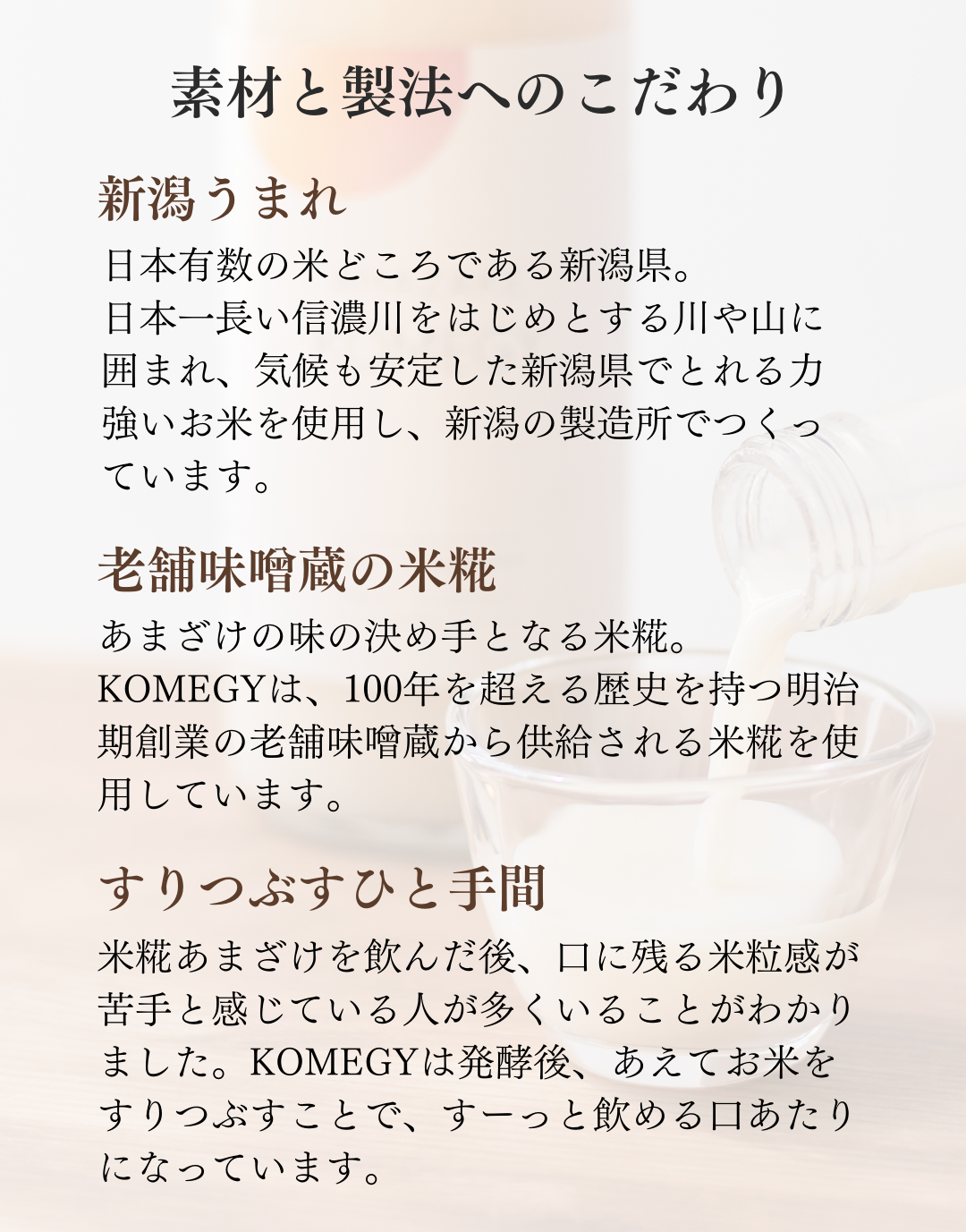 あまざけは苦手な方もいると思います。私自身苦手だと思う商品が沢山ありましたが、KOMEGYのあまざけはそんな方でもお米の自然な甘さや舌触りの良さに感動される方が沢山いると思っています。